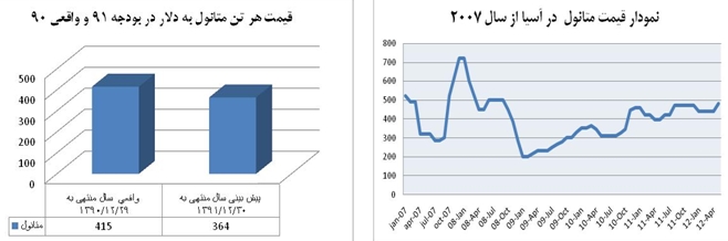 2-1- چنانچه در 2 نمودار زير مشخص است اين كاهش درآمد فروش ناشي از پيش بيني كاهش قيمت هر واحد متانول است نه كاهش مقدار توليد.