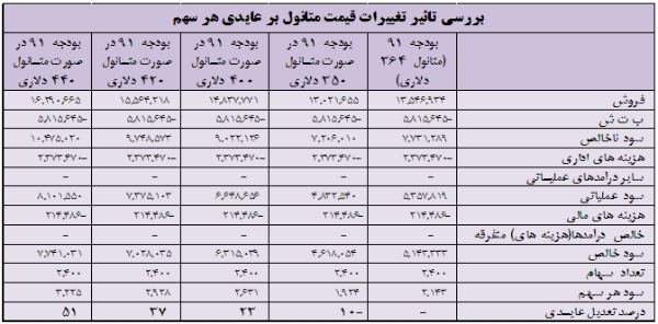 4-1- درآمد فروش صادراتي با 4 درصد كاهش نسبت به سال مالي 90 برآورد شده است. اين در حاليست كه درآمد فروش داخلي كه سهم ناچيزي از درآمد كل را دارد با 200 درصد رشد پيش بيني شده است. كاهش درآمد صادراتي ناشي از عامل نرخ تسعير ارز است نه كاهش حجم صادرات. در سال مالي 90 شركت دلار را به نرخ 13.557 ريال تسعير كرده در حاليكه در بودجه 91، نرخ تسعير 12.260 ريال پيش بيني شده است.
