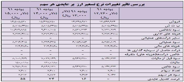 5- بررسي تاثير نرخ تسعير ارز بر عايدي هر سهم پتروشيمي زاگرس: با توجه به اينكه پتروشيمي زاگرس نرخ تسعير ارز را در بودجه 91 خود به نرخ مرجع (12.260 ريال) پيش بيني كرده است و ذكر اين نكته كه كارشناسان با توجه به وضعيت سياسي – اقتصادي كشور حداقل قيمت ارز را 14000 ريال مي دانند در اين قسمت به بررسي اثر تغيير نرخ تسعير بر عايدي هر سهم مي پردازيم.