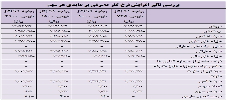 6-بررسي تاثير اجراي فاز دوم هدفمندي يارانه ها بر بهاي تمام شده و عايدي هر سهم: با توجه به اينكه در سال مالي 90 و بودجه 91 شركت، گاز طبيعي به نرخ هر واحد 735 ريال اعمال شده است و با امعان نظر به اينكه در صورت اجراي فاز دوم هدفمندي يارانه ها مقرر شده است كه قيمت گاز طبيعي به گونهای تعیین شود که به تدریج تا پایان برنامه پنجم معادل حداقل 75 درصد و حداکثر معادل متوسط قیمت گاز طبیعی صادراتی پس از کسر هزینههای انتقال، مالیات و عوارض شود و با ذكر اين نكته كه بهاي گاز طبيعي صادراتي فوب خليج فارس در حال حاضر حدود 2800 ريال بوده و 75 درصد آن حدود 2100 ريال محاسبه مي گردد، در اين قسمت به بررسي آثار افزايش بهاي تمام شده بر عايدي هر سهم شركت مي پردازيم: