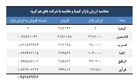 در جدول زیر ارزش بازار شرکت های مشابه با "کیمیا" در کنار مبلغ فروش پیش بینی شده برای سال مالی 94 آورده شده است. با بررسی نسبت فروش به ارزش بازار شرکت های مشابه به نظر میرسد بجز فرآور که بسیار با قیمت های ارزنده خود فاصله دارد این نسبت در میان سایر شرکت ها نزدیک بهم است.