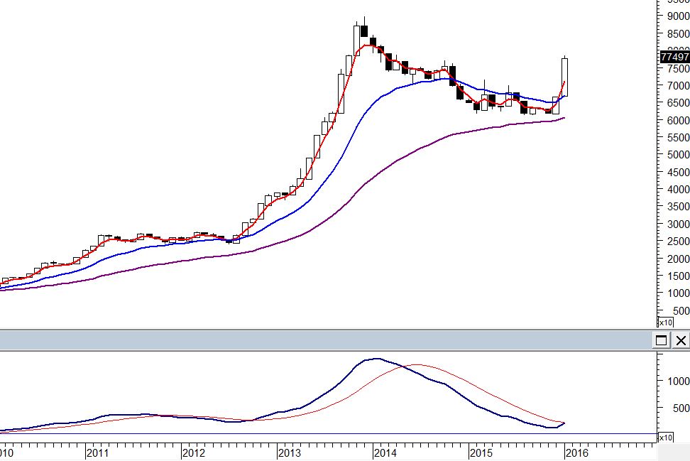 در شکل زیر نمودار ماهانه ( بلند مدت ) شاخص به تصویر کشیده شده است ، میانگین های متحرک و MACD سیگنال خرید در بلند مدت را صادر کرده اند که نمایانگر شروع حرکت صعودی در بلند مدت می باشد.