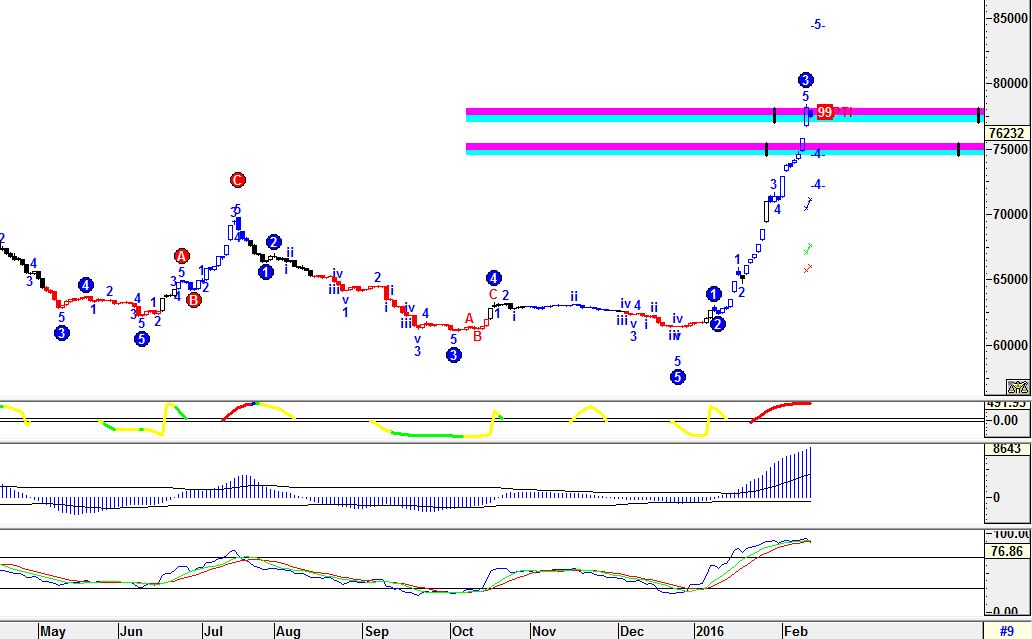 سطوح حمایت به ترتیب اولویت: محدوده ( 76800 تا 76200 ) و محدوده ( 74500 تا 75500 )