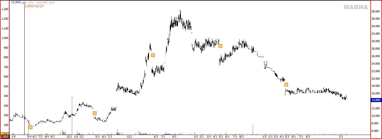 از طرف دیگر با توجه به صادراتی بودن محصولات شرکت، با افزایش قیمت دلار و افزایش دلاری محصولات این شرکت، سود شرکت می تواند از رشد خوبی برخوردار گردد. در نمودار زیر روند قیمتی شرکت را در 5 سال گذشته مشاهده می نماییم.