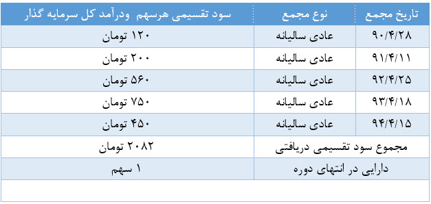 فرض کنید سرمایه گذار با استراتژی فوق در 5 سال پیش در تاریخ 90.2.27 یک سهم از شرکت را به قیمت 920 تومان خریداری نموده است. شرکت در طی این دوران 5 مجمع عمومی عادی سالیانه برگزار نموده و به شرح زیر dps توزیع نموده است.