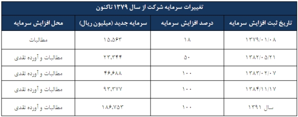 سرمایه شرکت در بدو تاسیس مبلغ 2.400میلیون ریال (شامل تعداد 2.400 سهم، به ارزش اسمی هر سهم 1.000.000 ریال) بوده که طی چند مرحله به مبلغ 186.753 میلیون ریال (شامل تعداد 186.753.072سهم، به ارزش اسمی هر سهم 1.000 ریال) افزایش یافته است.