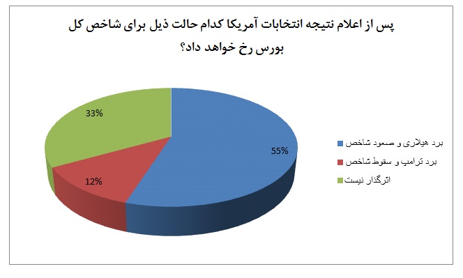 همانطور که از نمودار فوق مشخص است که 54.92 درصد از تعداد 4763 نفر شرکت کننده در نظرسنجی بورس نیوز به برد هیلاری کلینتون و رشد شاخص کل بورس رأی داده اند و تنها 11 درصد این افراد برد دونالد ترامپ و منفی شدن بازار سرمایه کشورمان را پیش بینی کرده بودند که در کمال ناباوری و بهت جهانی، ترامپ پیروز این رقابت تاریخی آمریکا شد.
