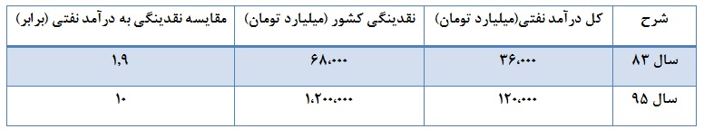 بر اساس اطلاعات موجود، کل درآمدهای نفتی کشور طی سال 83 حدود 36 هزار میلیارد تومان محاسبه می شود و نقدینگی کل کشور 68 هزار میلیارد تومان؛ به عبارت بهتر در سال مذکور نقدینگی سرگردان جامعه حدود 1.9 برابر کل درآمدهای نفتی بوده است. این در حالی است که طی سال جاری کل درآمد نفتی کشور به حدوداً 110 تا 120 هزار میلیارد تومان و نقدینگی جامعه به 1200 هزار میلیارد تومان رسیده و بدین ترتیب تا پایان امسال نقدینگی کشورمان 10 برابر کل درآمدهای نفتی می شود.