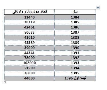 جدول زیر نشان دهنده واردات خودرو به ایران در سال های 1384 تا 1392 است.