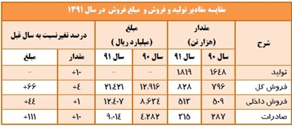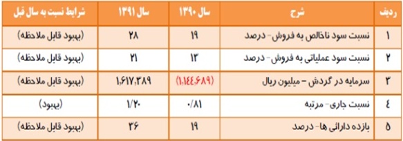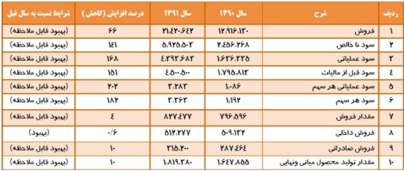 بسيار مفتخريم اعلام نماييم كه با وجود محدوديت ها و شرايط خاص حاكم بر اقتصاد جهان و بالطبع كشور عزيزمان توانستيم بازده مورد انتظار سهامداران محترم را برآورده نموده و با اتكال به خداوند بزرگ و همراهي شما سهامداران گرانقدر و بهره گيري از اراده استوار و با تلاش جمعي ، ضمن حضور فعال در عرصه اقتصاد كشور ، ارزش آفريني را براي همه ذينفعان از انديشه به عمل برسانيم و شرايطي را مهيا نماييم تا بتوان در راستاي برنامه هاي استراتژيك شركت قدم برداشته و با تخصص ، انعطاف پذيري و درك مناسب مديران و كاركنان در سال توليد ملي ، حمايت از كار و سرمايه ايراني موفق به كسب افتخارات و دستاوردهاي جديد به شرح ذيل درسال مالي 1391 نایل شويم: