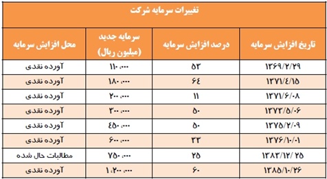 سرمايه شركت در بدو تأسيس مبلغ 72 ميليارد ريال بود كه طي چند مرحله به شرح زير به مبلغ 1.200 ميليارد ريال ( شامل 1,200,000,000 تعداد سهم، به ارزش اسمي هر سهم 1.000 ريال) افزايش يافته است.