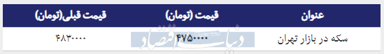 سکه در بازار امروز تهران، مانند دو روز پیش با کاهش قیمت روبرو شد، سکه که دو روز پیش تا 4,830,000 (چهار میلیون و هشتصد و سی هزار) تومان رسیده بود، امروز - شنبه 24 فروردین 1398 مصادف با 13 آوریل 2019 - با کاهش 1.68 درصدی به 4,750,000 (چهار میلیون و هفتصد و پنجاه هزار) تومان رسید.