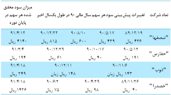 از جمله شرکت هایی که این رفتارها در ارایه صورت های عملکردی از آنها مشاهده شده می توان به شرکت صنعتی دریایی ایران، حمل و نقل خلیج فارس، ذوب آهن اصفهان و نیز پتروشیمی اصفهان اشاره کرد که در جدول زیر تاریخ و میزان ارقام پیش بینی شده سود هر سهم و در نهایت سود محقق شده پایان سال مالی 90 آنها آورده شده است.