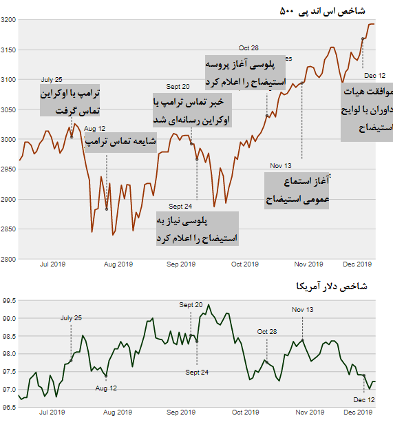بر این اساس، وال استریت عمدتا در روزهای اخیر بر توافق چین و آمریکا و همچنین آمار اشتغال متمرکز بوده است. به طوری که در میانه روز شاخص اس اند پی 500 رکورد تازهای را تجربه کرد. در نمودار زیر مشاهده میشود که در هر دوره با مطرح شدن بحث استیضاح مطرح شده، تقریبا بازارها واکنش نزولی خاصی نشان ندادهاند و حتی در بسیاری از موارد صعودی ماندهاند.