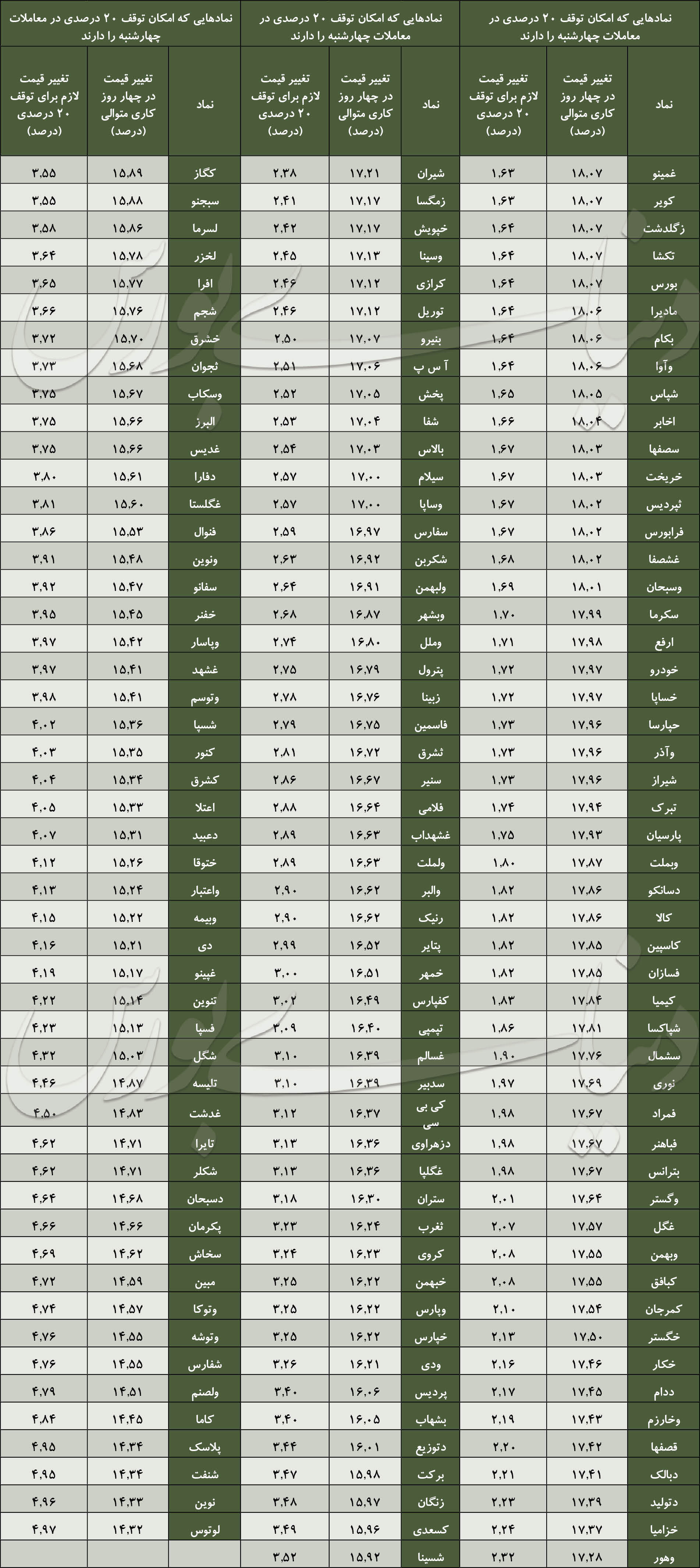 در جدول زیر نمادهای مستعد توقف جهت شفافسازی در خصوص دلایل ثبت رشد قیمت 20 درصد در 5 روز کاری متوالی در یک جدول به تصویر کشیده شدهاند. ستون آخر هر قسمت میزان رشد لازم برای توقف هر نماد در روز آینده آورده شدهاست. لازم به ذکر است در صورتی که رشد قیمتها کمتر از میزان لازم باشد، از این قانون خارج میشوند و معاملات آنها در جریان خواهد بود.
