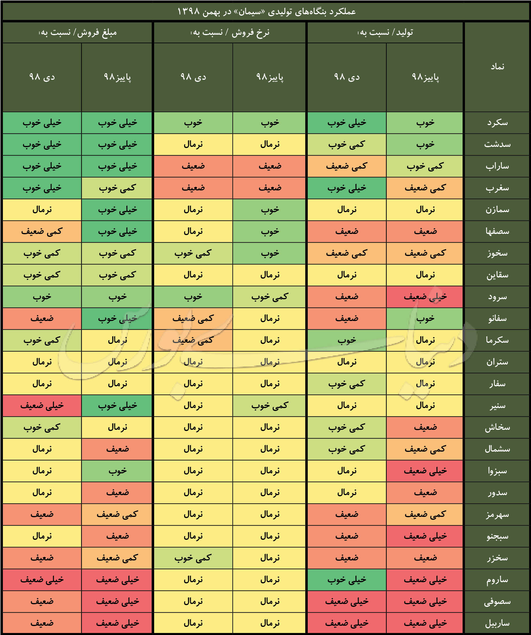 در جدول زیر سه مولفه تولید، مبالغ و نرخهای فروش سیمانیها با عملکرد ماه دی و میانگین پاییزی مقایسه شده است؛ سعی شده تا این شرکتها بر اساس کیفیت عملکرد خود در این جدول مرتب شوند؛ به این معنا که ردیفهای فوق بهترین عملکردهای سیمانی را نشان میدهد و ردیفهای پایانی دال بر عملکرد ضعیف شرکتهاست. با این حال، این قیاس به هیچ وجه قطعی نیست؛ برای مثال میزان سودآوری و هزینه شرکتها در نظر گرفته نشده و تنها بر اساس 3 مولفه مذکور ردهبندی انجام گرفته است.